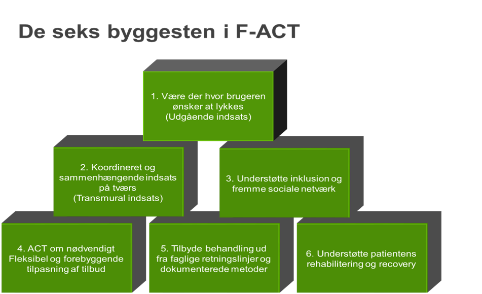 Øget fokus på empowerment og recovery: F-ACT skal yde støtte der, hvor patienten ønsker at lykkes. Ansatte med brugererfaring skal inddrages i behandlingen for at styrke håbet om at komme sig/leve et godt liv med sin sygdom. Der er også fokus på at arbejde med at understøtte inklusion og fremme af sociale netværk.